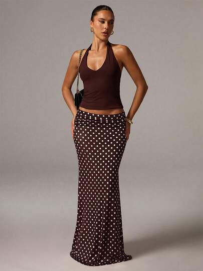 Avenya Falda ajustada con estampado de lunares tejida, de moda y versátil para el verano - Marrón Mocha - Añade 5