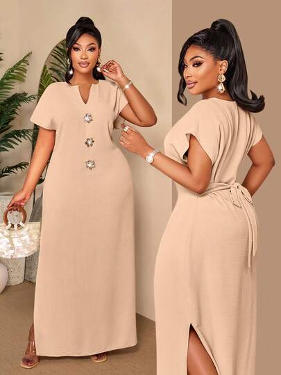 BIUBIU Vestido largo decorativo con botones de talla grande en beige - Vestido maxi con cuello en V, manga corta, cintura con lazo y abertura en la espalda, adecuado para vacaciones de verano y uso diario casual elegante