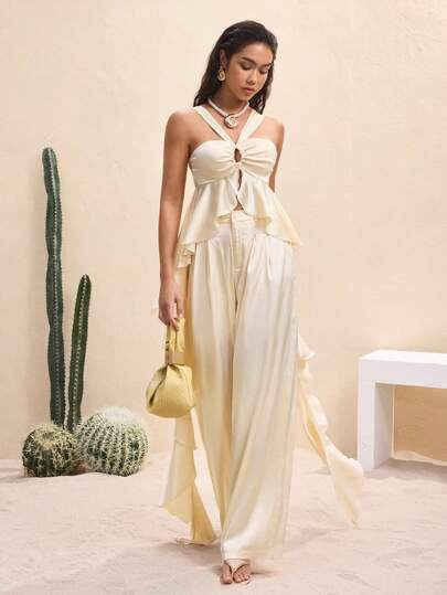 BY FELIZIA Pantalones elegantes de cintura alta, pernera ancha y plisados en satén color albaricoque sólido - Albaricoque - Añade 1