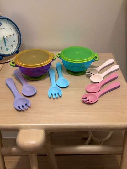 Conjunto de cuenco y cuchara-tenedor para bebé con tapa y ventosa, juego de plato y vajilla infantil con doble asa - Multicolor - Añade 6