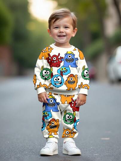 SHEIN Conjunto informal para bebé niño con pullover suelto de punto suave con cuello redondo y estampado de dibujos animados - Multicolor - Añade 1