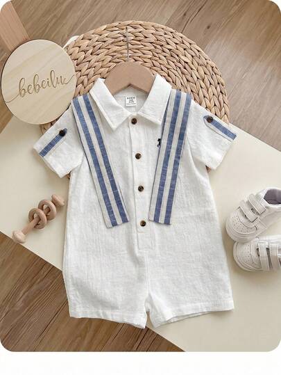Camisa de manga corta de unicolor con estilo universitario casual para niño/niña, mono corto con cuello de chal a rayas, adecuado para usar en primavera/verano en casa o al aire libre