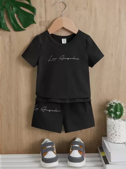 SHEIN Bebé niño Shorts con camiseta con estampado de letra - Negro - Añade 2