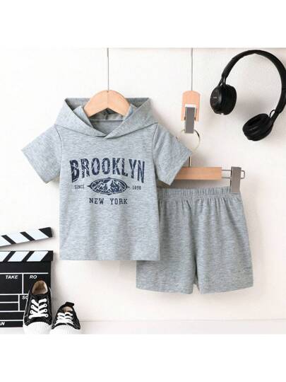 Conjunto De Sudadera De Manga Corta Con Capucha Y Shorts Estampados Con Letras Para Bebé Niño - Gris - Añade 1