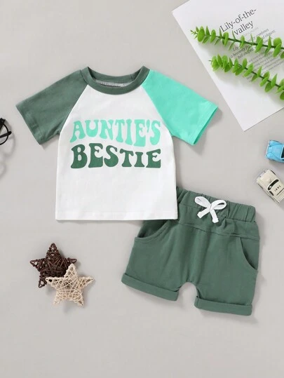 Conjunto de playera estampada con letra y short con bolsillo para niño pequeño, primavera/verano - Verde - Añade 2