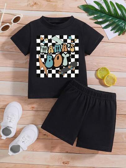 Conjunto Casual Y Versátil De Manga Corta Y Pantalón Corto Cómodo Con Patrón De Letras Para Niños Pequeños En Casa - Negro - Añade 1