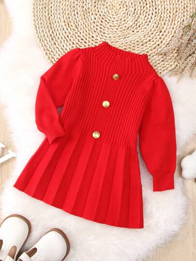 Bebé niña Vestido de punto con botón delantero fruncido - Rojo - Añade 1