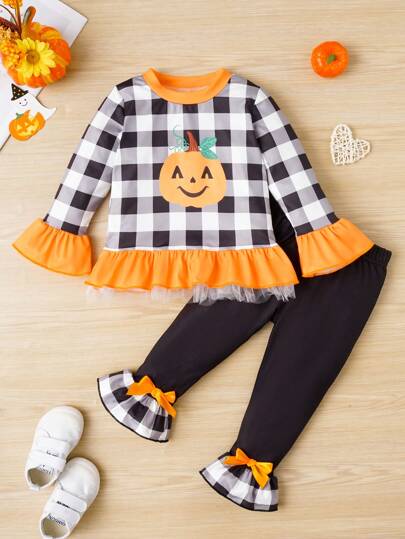 Bebé niña Camiseta con estampado de dibujos animados de manga con volante bajo con fruncido & Pantalones con lazo delantero - Multicolor - Añade 2