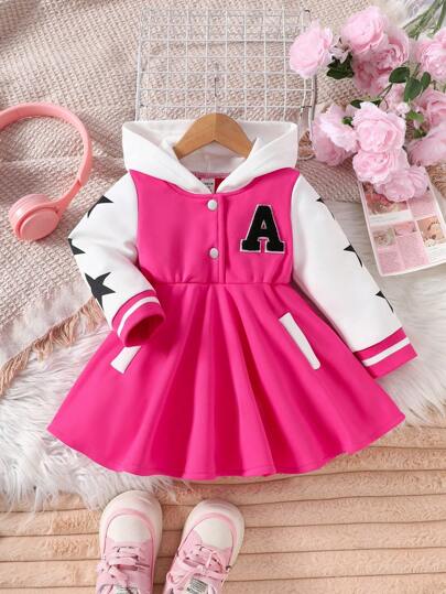 Vestido de manga larga con capucha, botones frontales y parche con letra para bebé niña - Rosa Fucsia - Añade 5