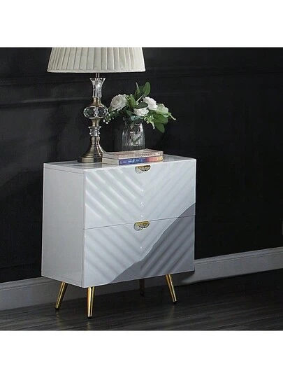 Mesa de noche de 2 cajones en acabado blanco alto brillo - Blanco + Madera + Metal + 2 Cajones + Cajones + Blanco + Dormitorio como en la imagen - Añade 5
