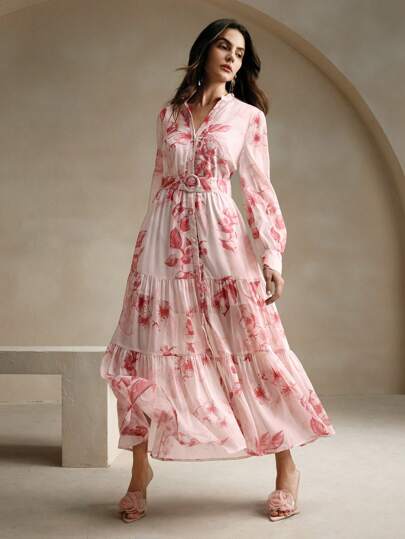 Anewsta Vestido elegante de mangas largas y cintura definida con estampado floral menudo para mujer, conjunto de vestido maxi rosa - Rosa - Añade 1