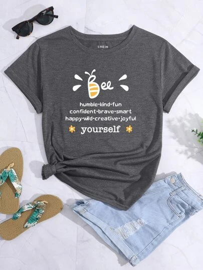 SHEIN LUNE Camiseta con estampado de abeja y slogan - Gris Oscuro - Añade 5