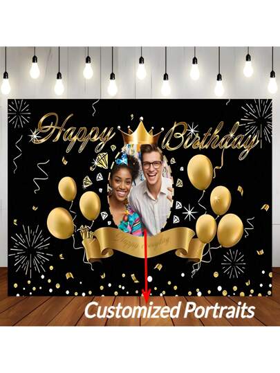 Fondo personalizable con diseño de globos dorados, fuegos artificiales y cintas para retrato de cumpleaños en tela, con decoración de mesa de pastel, pancarta de vinilo para fiesta de cumpleaños - Multicolor - Añade 1