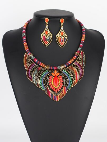 Set de collar bohemio con collar y aretes con patrón aleatorio, Sets de joyas de moda para mujer - Rojo - Añade 15