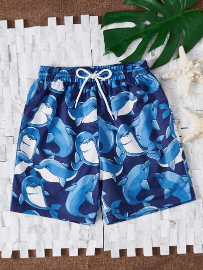 SHEIN Chicos Shorts de natación con estampado de delfín con cordón - Azul Marino - Añade 2