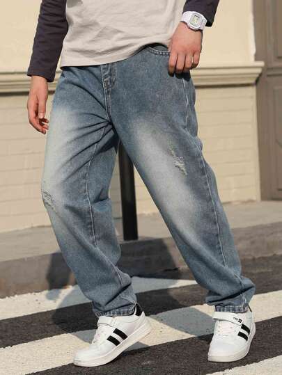 Jeans rectos de pierna casual con lavado vintage para niños, pantalones vaqueros rotos para adolescentes, primavera/otoño - Azul - Añade 4