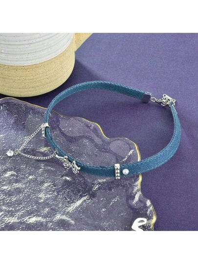Collar de cadena de cuello azul retro con colgante de mariposa con flecos, serie de mezclilla de alta gama