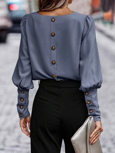 SHEIN Clasi Blusa con botón trasero de manga gigot - Neblina azul - Añade 5