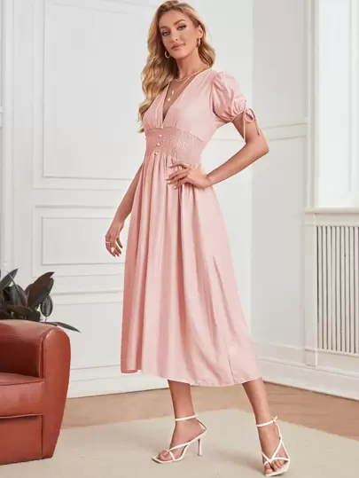 Vestido de cintura con fruncido de puño con cordón con botón delantero - Rosa Pálido - Añade 5