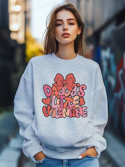 Jersey holgado de cuello redondo, de manga larga, casual y cómodo con estampado de lazo y mensaje de amor para el Día de San Valentín - Gris - Añade 1