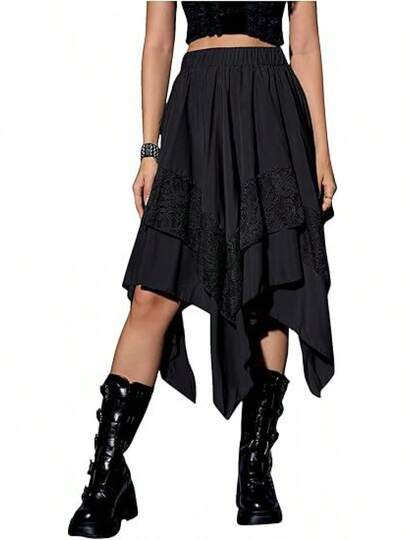 Falda asimétrica de la época renacentista de Halloween con dobladillo ancho COS, falda para mujer - Negro - Añade 5