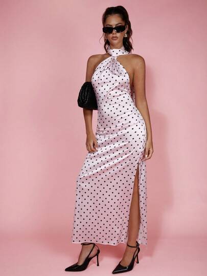 COSMINA Vestido con abertura lateral y espalda descubierta con estampado de lunares para mujeres - Rosa Pálido - Añade 8
