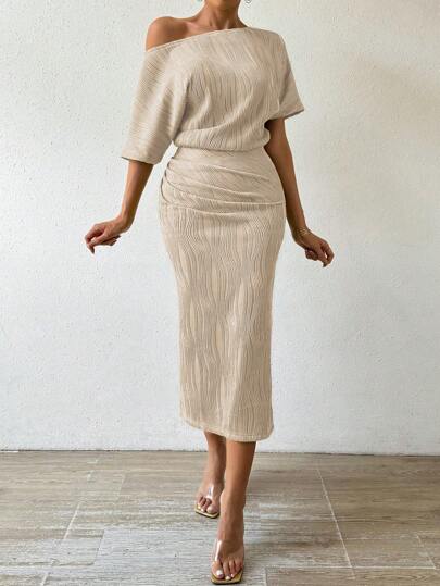 Chiquease Vestido elegante de hombro asimétrico para damas - Albaricoque - Añade 1