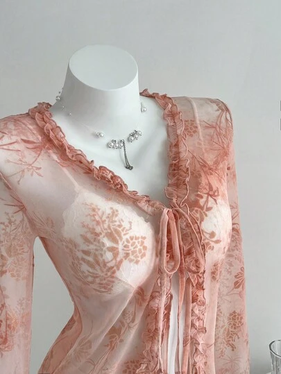 Elamini Cárdigan de manga larga transparente con escote en V, volantes y lazo, ajustado - Rosa - Añade 1