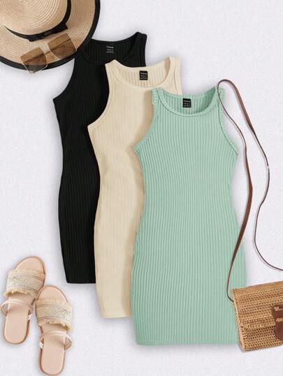 SHEIN LUNE Set de 3 vestidos casuales de punto sin mangas de unicolor y ajustados para mujeres - Verde - Añade 5