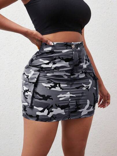BamGleam Falda cargo con estampado de camuflaje con bolsillo con solapa - Blanco y Negro - Añade 6