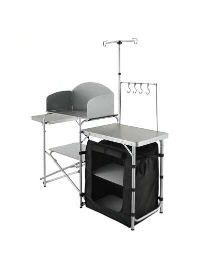 Mesa de cocina para camping, mesa de cocina plegable para exteriores con bolsa de transporte, estación de cocina de aluminio con 1 armario y parabrisas desmontable, montaje rápido para picnics, barbacoas, viajes en autocaravana - Plateado - Añade 1