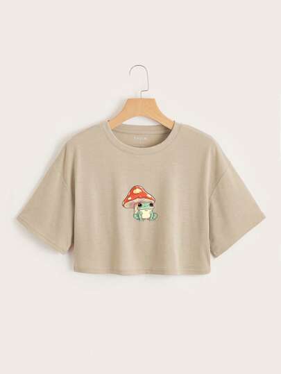 INAWLY Camiseta corta de mujer con estampado de dibujos animados y setas, con hombros caídos - Caqui - Añade 4