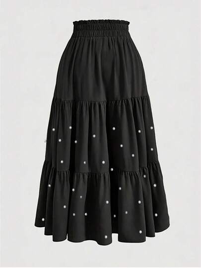 SHEIN Unity Falda línea A elegante de unicolor con decoración de perlas, estilo casual para tallas grandes - Negro - Añade 1