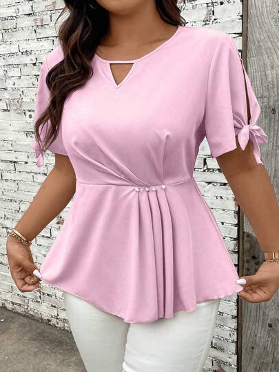 Celure Blusa de talla grande de unicolor, diseño simple de verano con top tipo peplum - Rosa - Añade 1