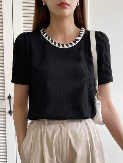 DAZY Camiseta de mujer de manga corta con cuello redondo y bloque de color con decoración de bolsillo falso - Negro - Añade 6
