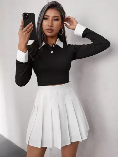 de cuello en contraste Camiseta corta & Falda fruncido - Blanco y Negro - Añade 2