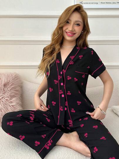 Conjunto de pijama para damas con estampado de cerezas y manga corta con pantalón a Set y ribete contrastante - Negro - Añade 1