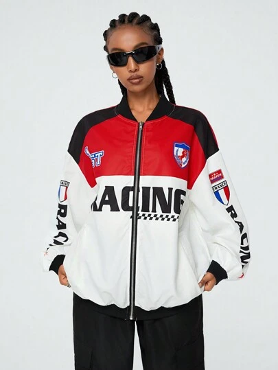 Coolane Chaqueta bomber de mujer con diseño de rayas y letras gráficas, hombros caídos - Multicolor - Añade 5