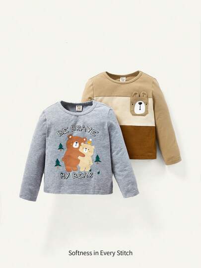 Cozy Pixies Conjunto De 2 Piezas Camiseta Redonda De Cuello Con Estampado De Oso Y Camisa Con Bloques De Diferentes Colores Para Bebé Niño - Marrón - Añade 2