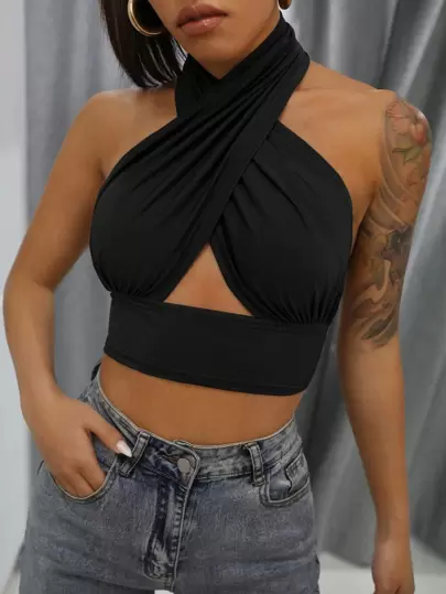 RueChic Top halter corto con tira cruzada de espalda abierta con cordón - Negro - Añade 5