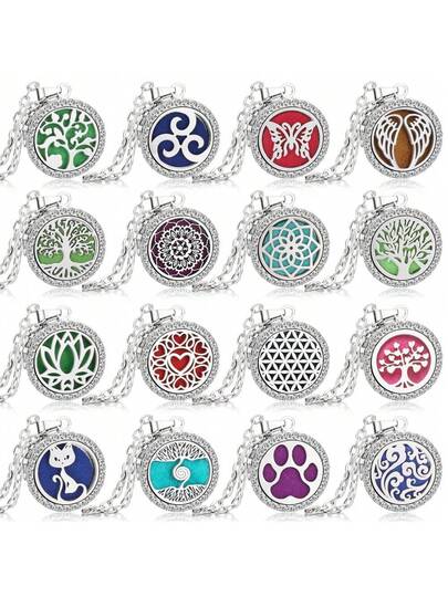 Collar colgante de aromaterapia de cristal con difusor de aceites esenciales, diseño del árbol de la vida y flor, joya colgante con aroma y rhinestones - Plateado - Añade 16
