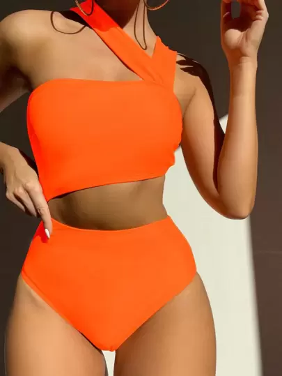 SHEIN Swim Traje de baño de una pieza con corte de cintura y cuello asimétrico sin hombros para playa en verano - Naranja - Añade 1