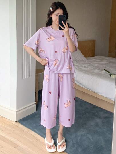 DAZY Lindo conjunto de pijama de verano de manga corta con estampado de corazón y oso con pantalones largos - Morado - Añade 1