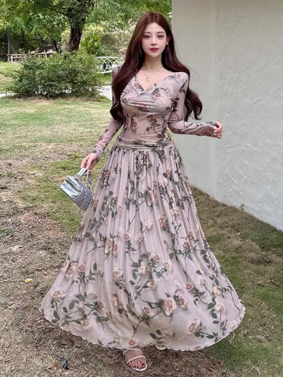 DAZY Conjunto de 2 piezas: Blusa de hombros descubiertos con pliegues de malla floral y falda - Mujer, Volantes, Ropa de mujer para otoño, Atuendos de vacaciones para mujer - Rosa - Añade 1