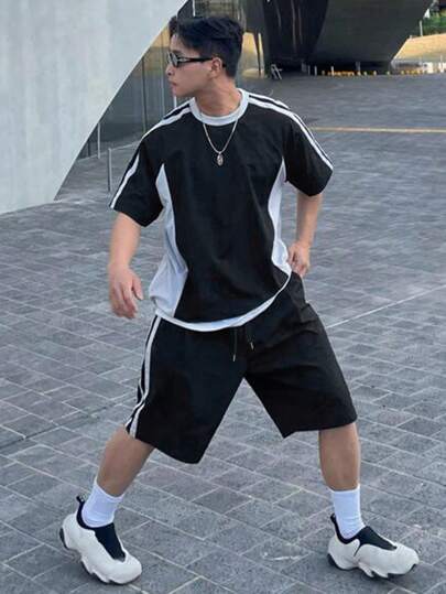 DAZY Set de 2 piezas con camiseta de manga corta de bloque de color contrastante y pantalones cortos rectos para hombre - Negro - Añade 6