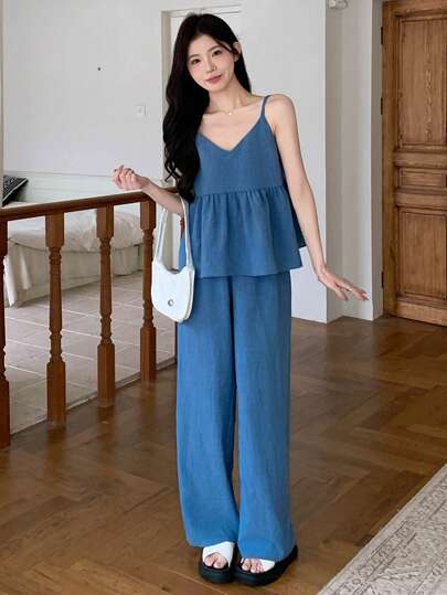 DAZY Set de 2 piezas de mujer: Camiseta de tirantes y pantalones largos informales de unicolor con volantes para el verano - Azul - Añade 1