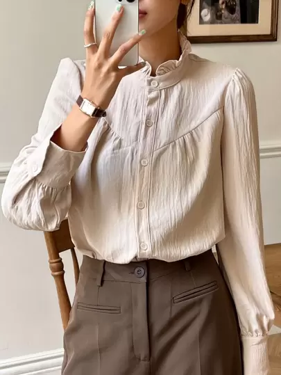 DAZY Camisa de manga abullonada con cuello alto de unicolor, estilo casual de negocios, ropa de otoño, ropa de vuelta al colegio, tops con estilo universitario de manga larga - Albaricoque - Añade 10