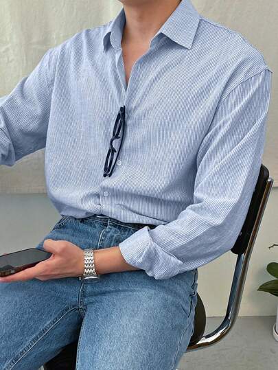DAZY Camisa de hombre con botones y rayas, camisa de hombre de manga larga para otoño - Azul - Añade 5