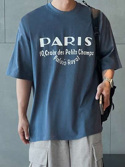 DAZY Camiseta básica azul con estampado de letras para hombre, camisetas gráficas - Azul - Añade 1