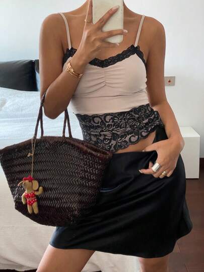 DAZY Camiseta ajustada para mujer con bloque de color y ribete de encaje transparente - Rosa - Añade 1